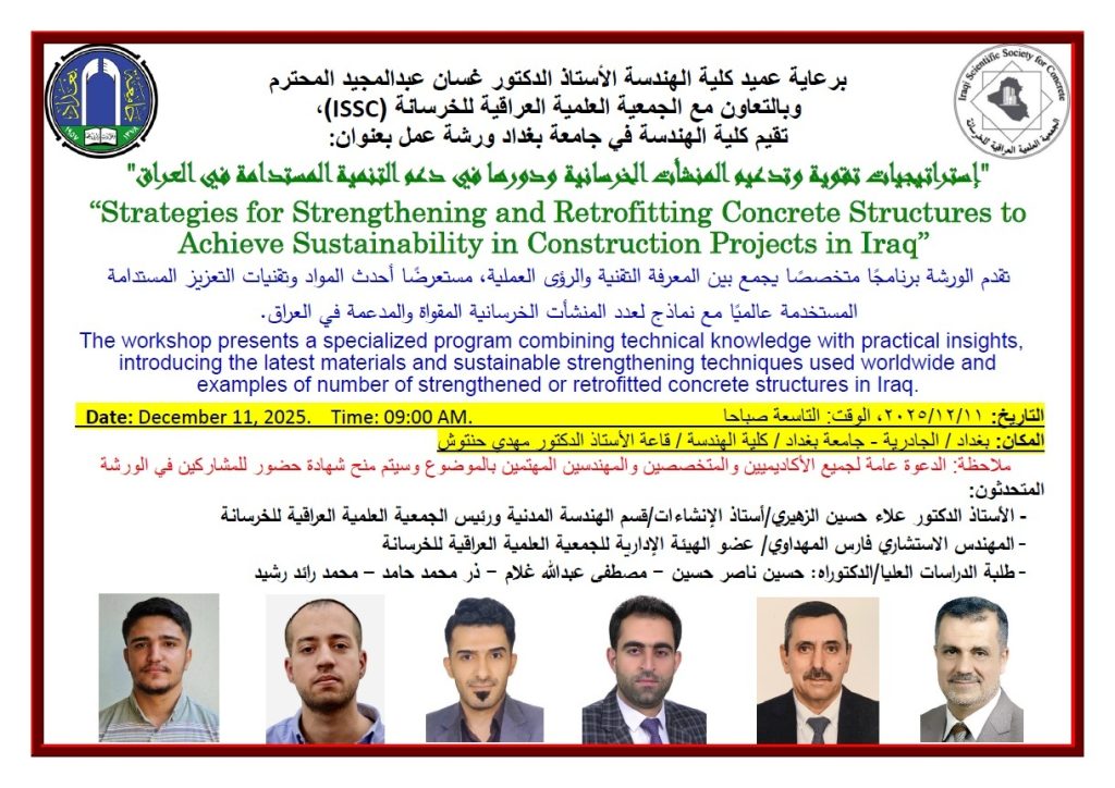 في يوم الخميس المصادف 11/12/2025 على قاعة الأستاذ الدكتور مهدي حنتوش في كلية الهندسة/جامعة بغداد في الجادرية. تقدم هذه الورشة برنامجًا متخصصًا يجمع بين المعرفة التقنية والرؤى العملية، مستعرضًا أحدث المواد وتقنيات التعزيز المستدامة المستخدمة عالميًا مع نماذج لعدد المنشأت الخرسانية المقواة أو المدعمة في العراق.