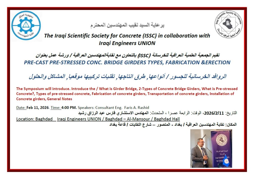 في إطار سلسلة فعالياتها العلمية الرامية إلى تطوير الكفاءات الهندسية وتعزيز جودة التنفيذ في المشاريع الإنشائية بما يواكب أحدث تقنيات البناء، تُنظم الجمعية العلمية العراقية للخرسانة (ISSC) بالتعاون مع نقابة المهندسين العراقية ورشة عمل بعنوان: